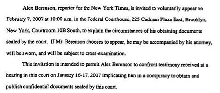 This is incredibly interesting. Judge Weinstein has “invited” (Download berenson.pdf) Alex Berenson from the New York Times to discuss his role in the Zyprexa document leak: