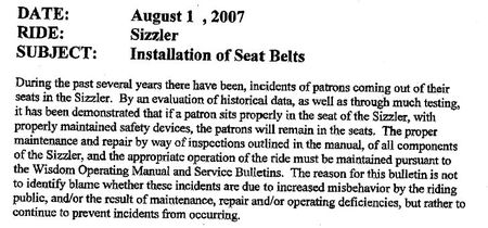 Wisdom, the ride’s manufacturer, has this month (finally?) issued an advisory urging the addition of seatbelts.  It’s available here: Download Sizzler_Bulletin_8_01_07.pdf.  The introduction is carefully phrased but gives the main idea: